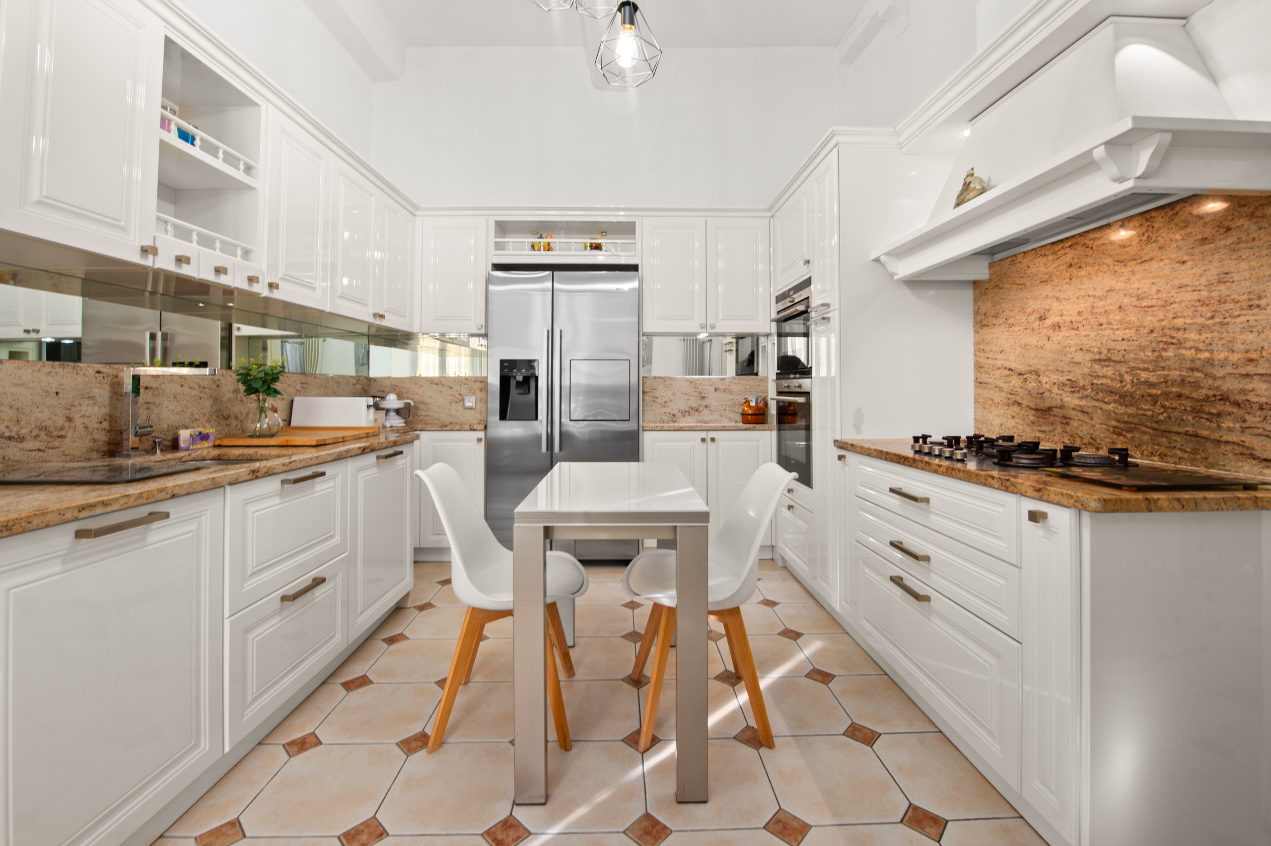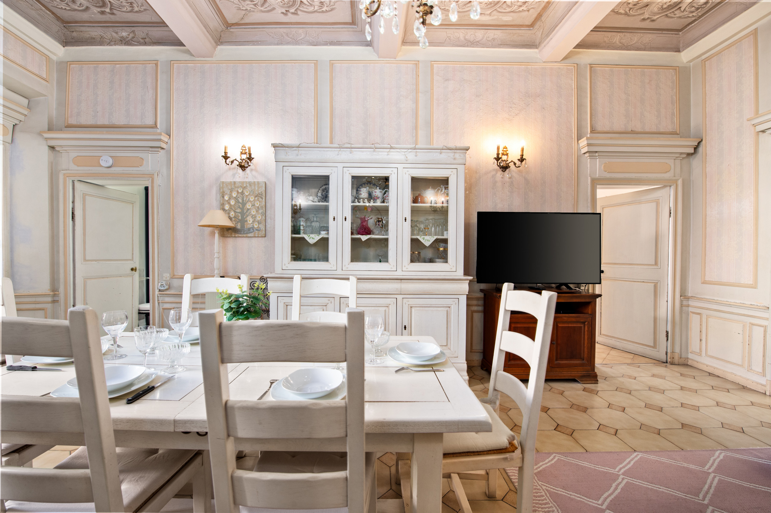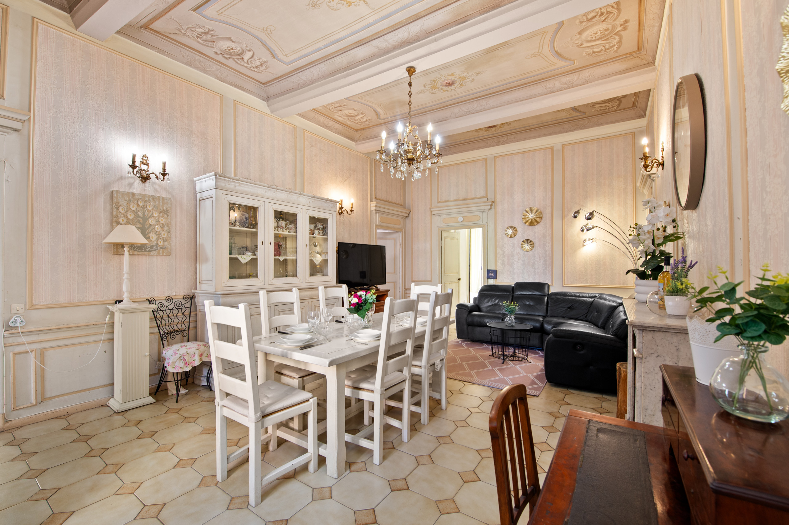 You will enjoy a vast, luminous and refined living-dining room, fitted with large comfortable sofas, a decorative fireplace, a large table for family or friends' meals, as well as a superb chandelier and decorative elements that highlight the historical charm of the place.