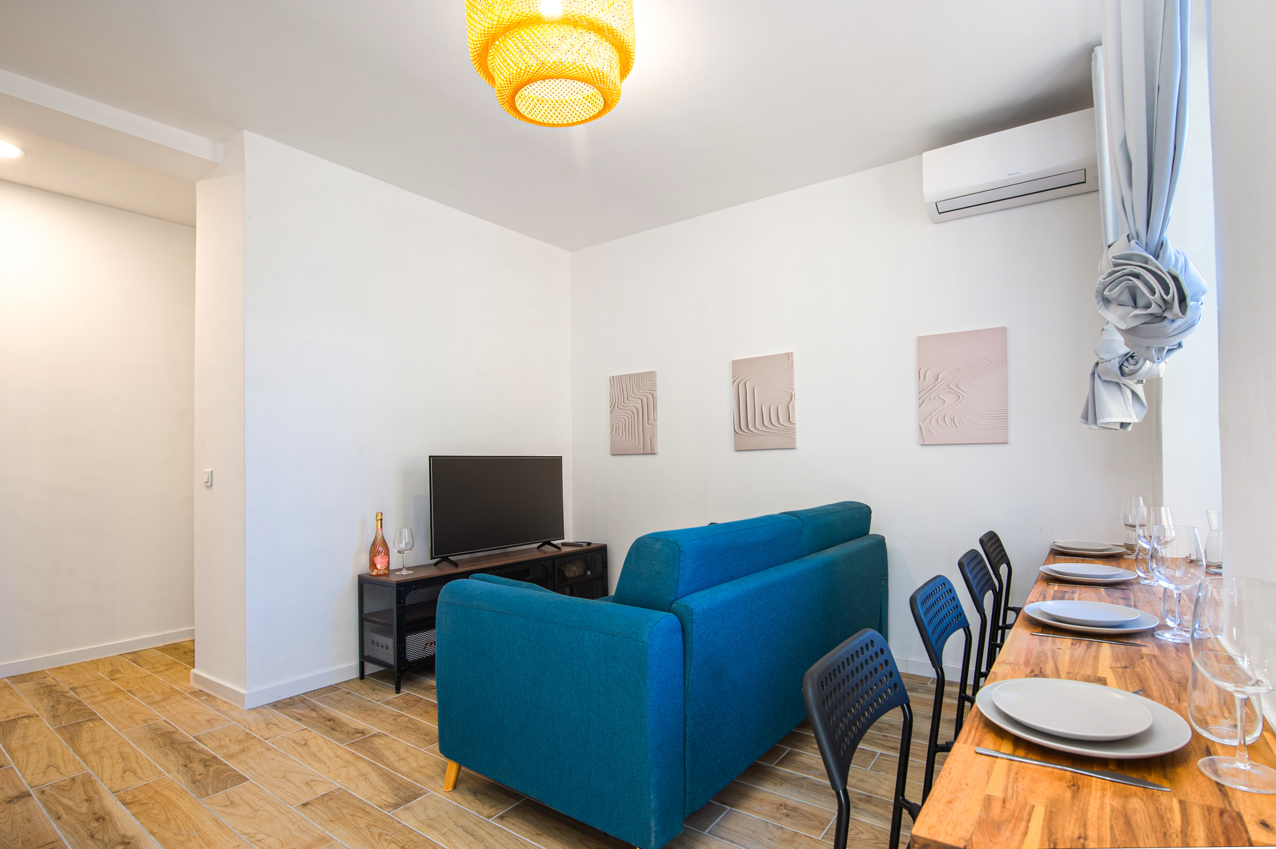 🛋 Living room: sofa, flat-screen TV, dining area.