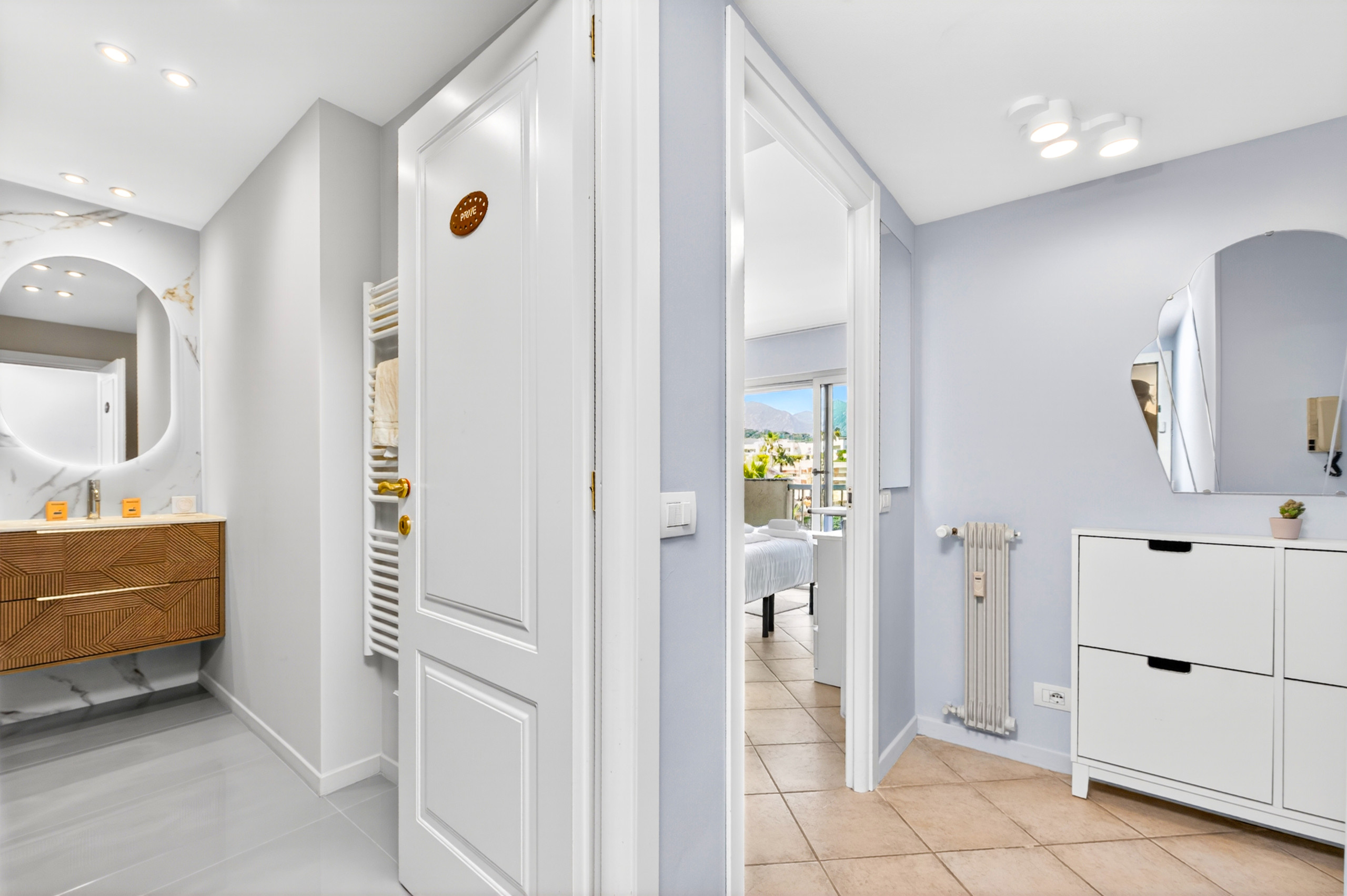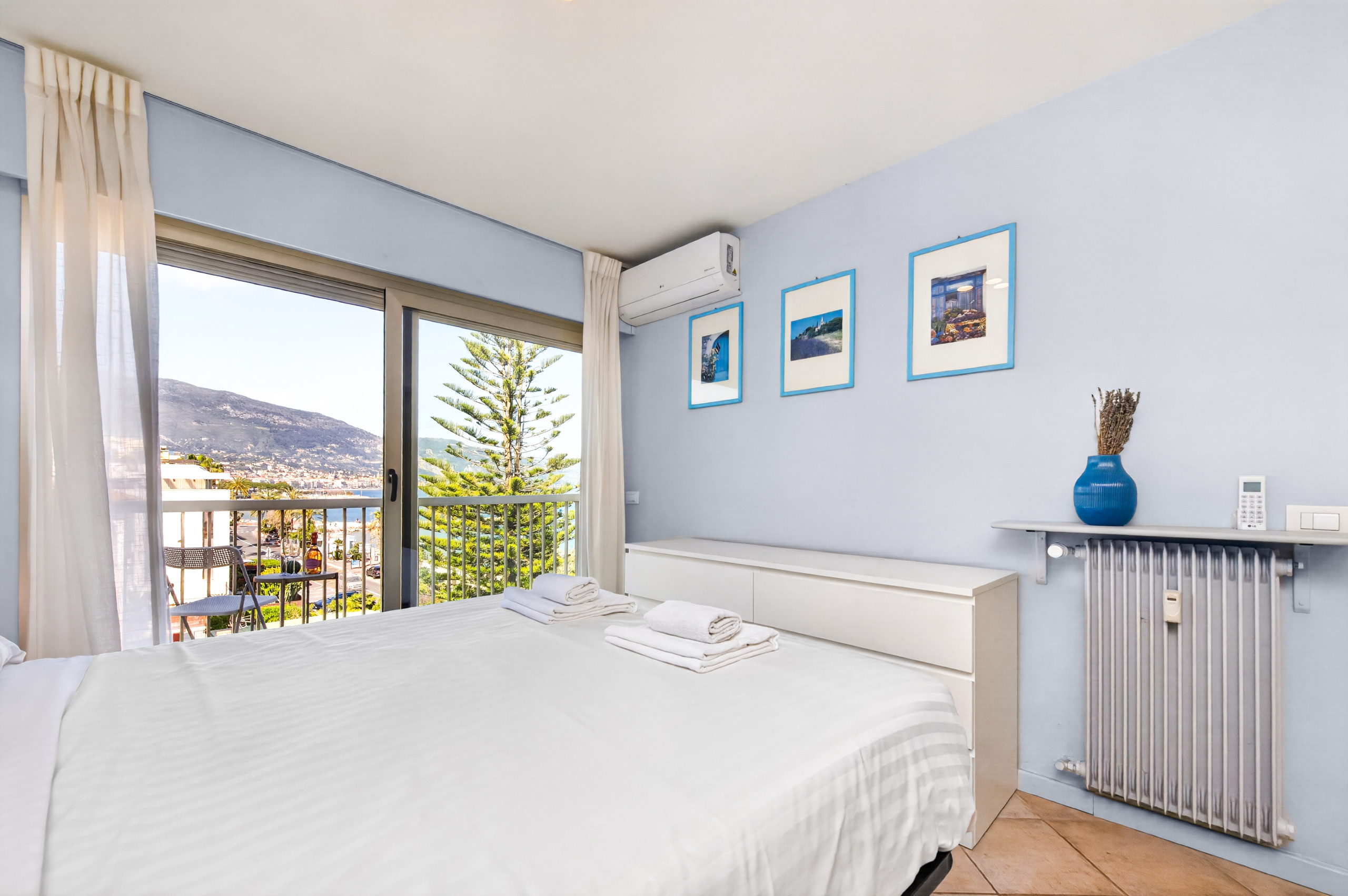 This spacious and elegant apartment can accommodate up to 6 people. It has two bedrooms, each equipped with a double bed. The living room includes a sofa bed. The apartment includes a terrace that offers sea views. Located just a few steps from the sea, you can easily access the beach. The apartment is also close to the train station and restaurants.