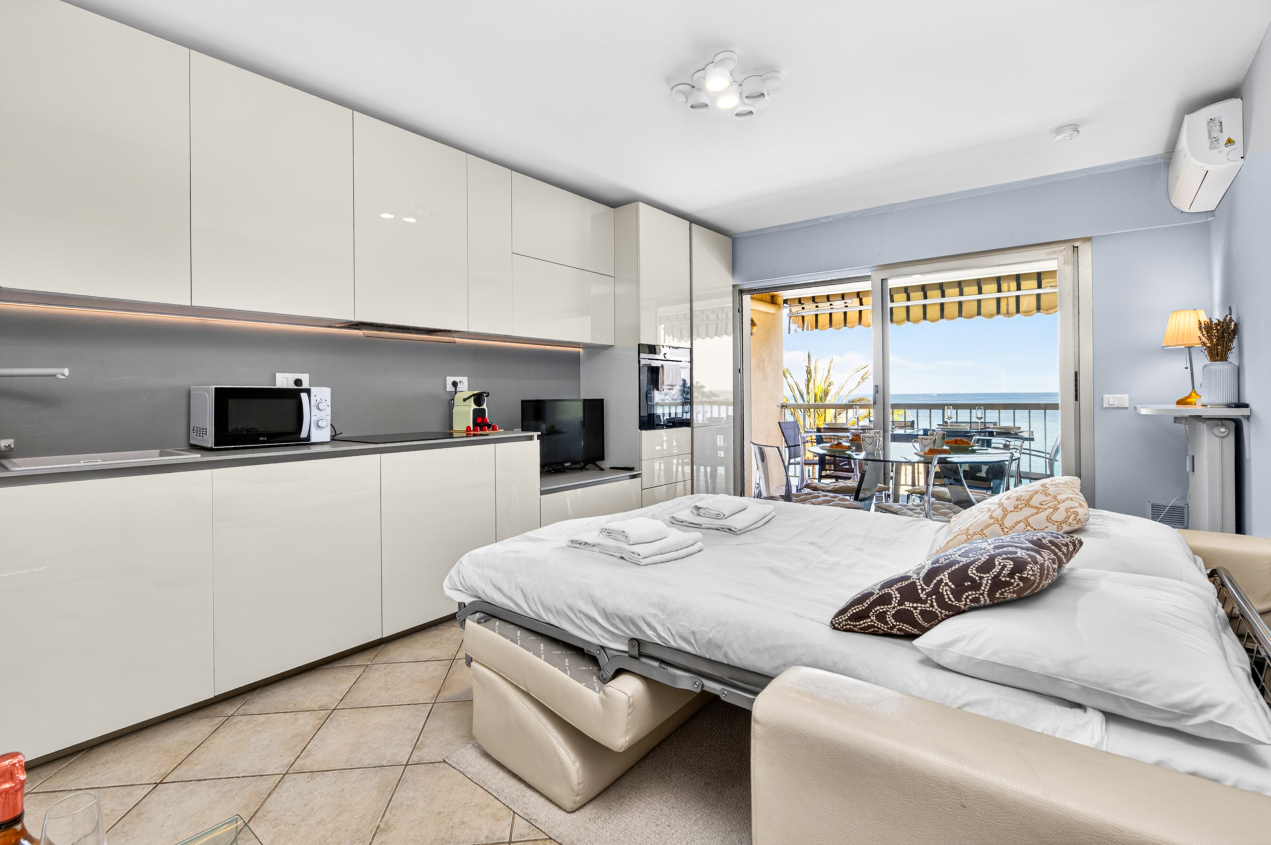 Air conditioning and Wi-Fi included. Just steps from the sea and local shops.