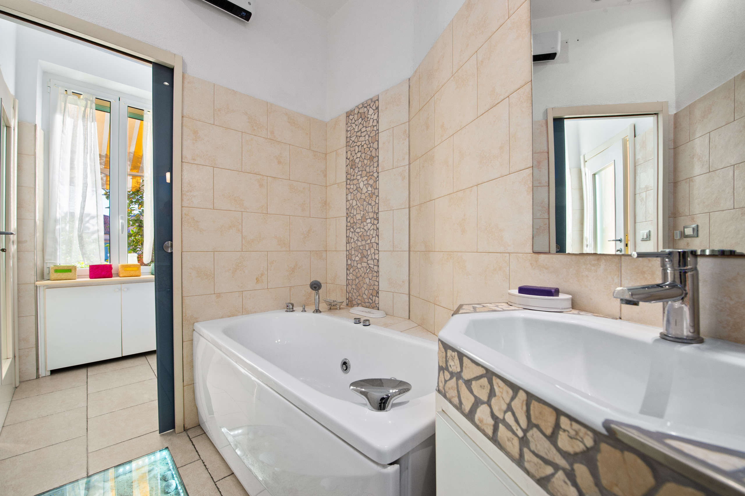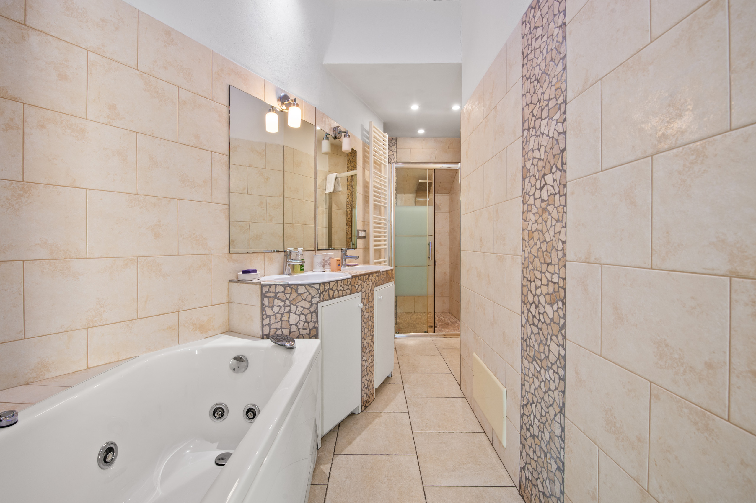 La salle de bain est spacieuse et élégante, équipée d’une grande baignoire balnéo/jacuzzi, idéale pour se détendre après une journée de marche ou de plage. Elle est aménagée avec soin et offre un excellent niveau de confort.