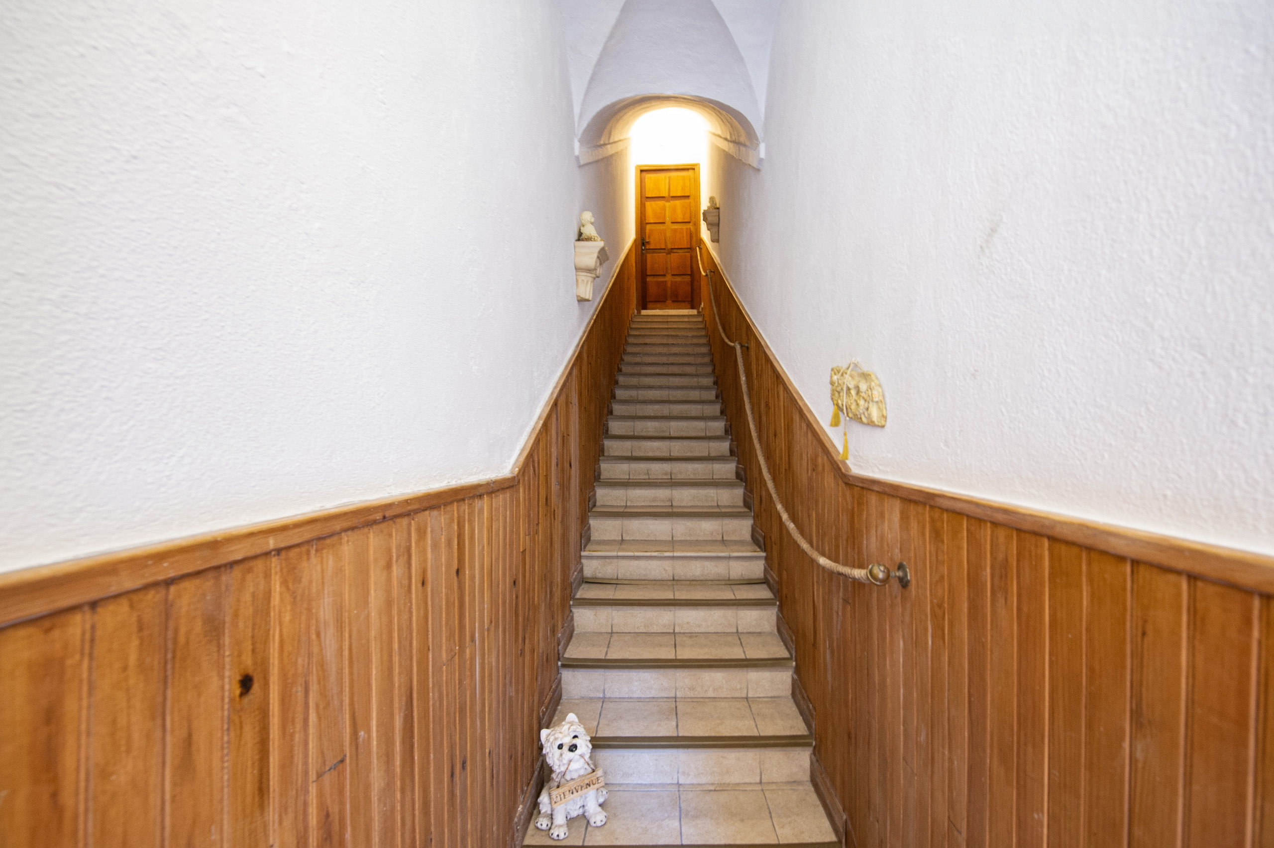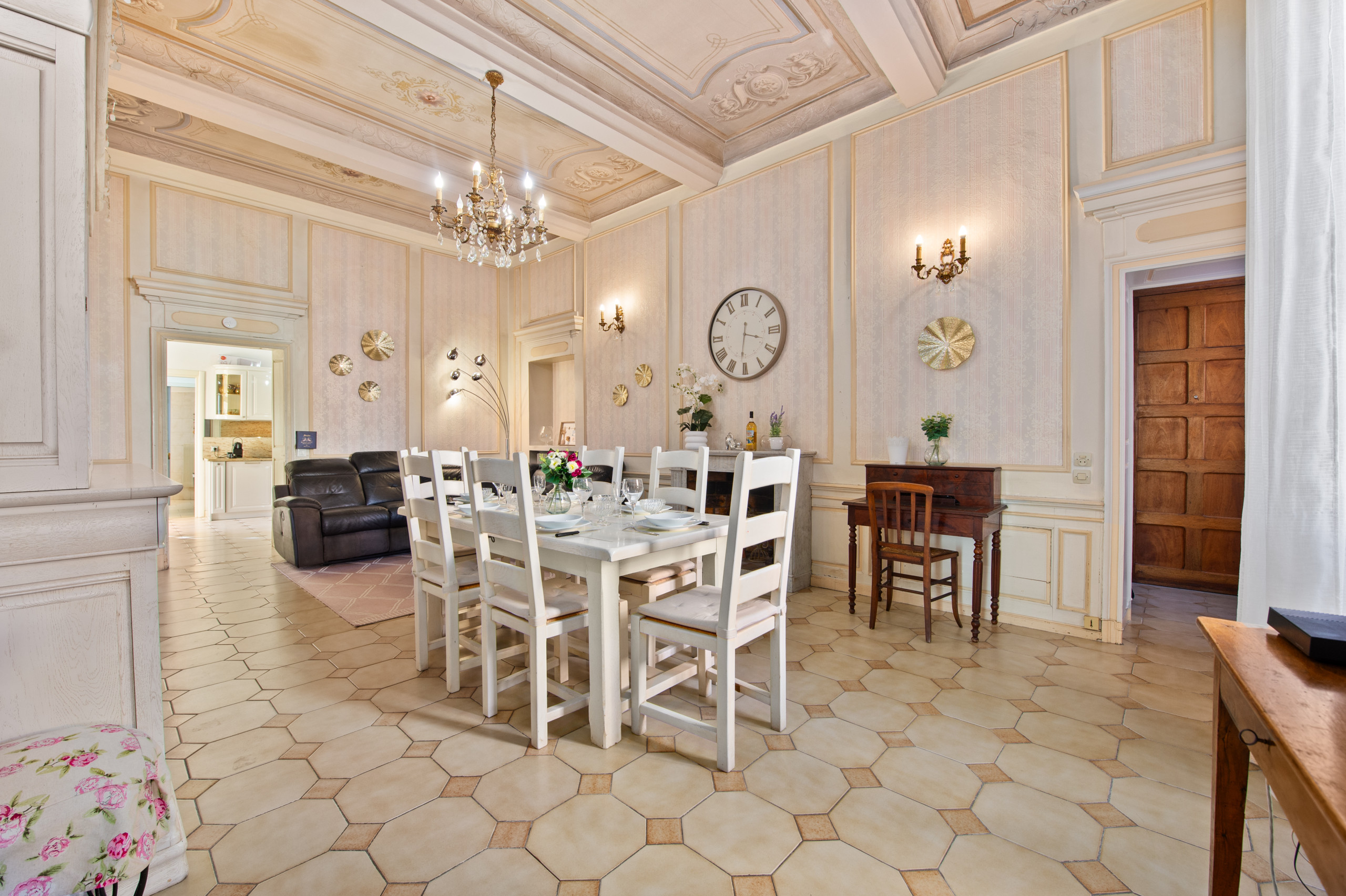 Vous profiterez d’un vaste salon-salle à manger lumineux et raffiné, aménagé avec de grands canapés confortables, une cheminée décorative, une grande table pour les repas en famille ou entre amis, ainsi qu’un superbe lustre et des éléments de décoration qui soulignent le charme historique du lieu.